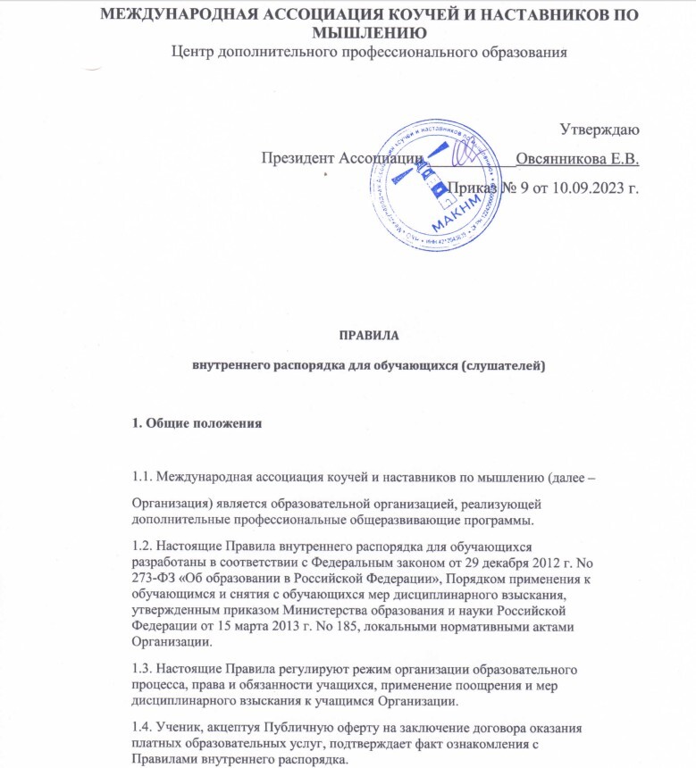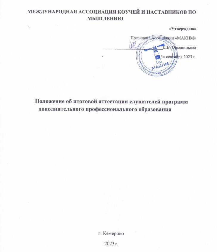 1.1. Настоящее Положение «Об итоговой аттестации слушателей программ дополнительного профессионального образования в Международной Ассоциации коучей и наставников по мышлению (далее – Положение, Организация)разработано в соответствии с Федеральным законом РФ «Об образовании в Российской Федерации» №273-ФЗ от 29 декабря 2012 г., Приказом Министерства образования и науки Российской Федерации от 1 июля 2013 года №499«Обутверждении порядка организации и осуществления образовательной деятельности по дополнительным профессиональным программам», Инструктивным письмом Минобразования РФ от 21 ноября 2000 № 35-52-172 ик/35-29 с Рекомендациями по итоговой аттестации слушателей образовательных учреждений дополнительного профессионального образования, письмом Минобрнауки России от 30марта2015№АК-821/06 «О направлении методических рекомендаций по итоговой аттестации слушателей».